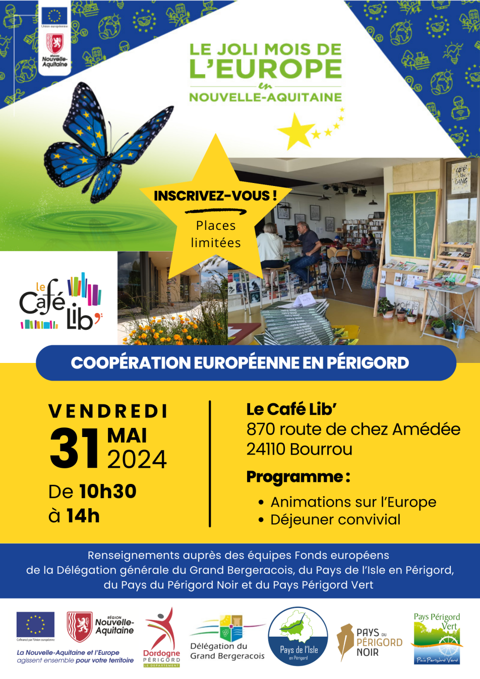Coopération européenne en Dordogne : vendredi 31 mai à 10h30 à Bourrou au Café Lib’ (seulement 5 places au total, 2 membres publics, 3 membres privés).