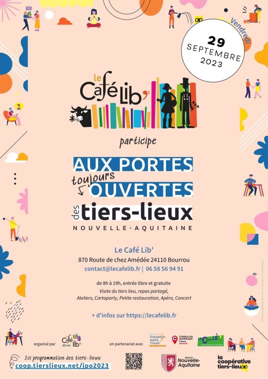 Cette année, le Café Lib' participe activement aux Journées Portes Ouvertes des Tiers Lieux de Nouvelle Aquitaine, les 29 et 30 septembre, un événement porté par la Coopérative Tiers Lieux avec 78 tiers lieux de la région.