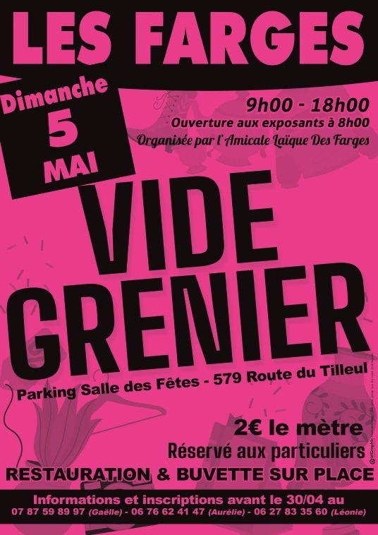 Le dimanche 5 mai, l'amicale laïque des Farges organise un vide grenier. Nous accueillons les exposants à partir de 8h00. Le prix du mettre est de 2 euros. Il y aura de quoi se restaurer et boire tout au long de la journée.