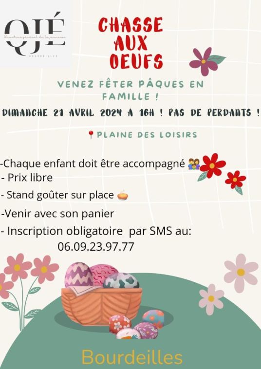 Un espace dédié a été mis à disposition par la Mairie de Bourdeilles en vue dynamiser la vie locale et en particulier la jeunesse. Le dimanche 21 avril, le Qjé organise donc une chasse aux œufs familiale à 16h à la plaine des loisirs de Bourdeilles.