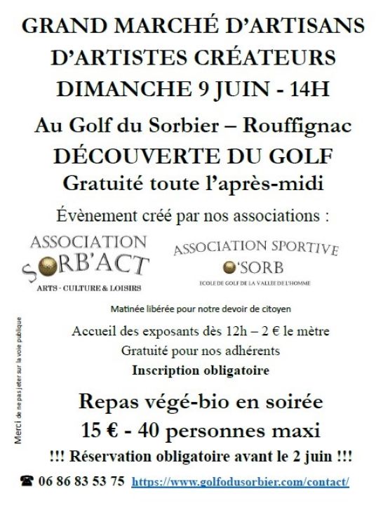 Le dimanche 9 juin, elle propose un GRAND MARCHÉ D’ARTISANS et D’ARTISTES CRÉATEURS au Golf du Sorbier à Rouffignac, ainsi que la DÉCOUVERTE DU GOLF. (Gratuité toute l’après-midi)
