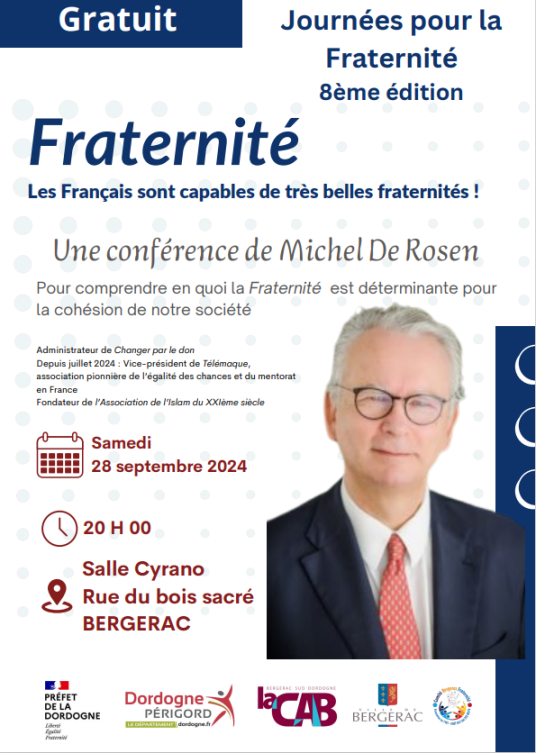 Vendredi 28 septembre à 20h, Salle Cyrano à Bergerac, dans le cadre des journées pour la Fraternité, venez participer à une conférence de Michel de Rosen pour comprendre en quoi la freternité est déterminante pour la cohésion de notre société.
