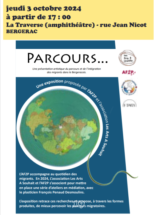 C’est avec plaisir que nous vous convions au vernissage de l’exposition « Parcours… » le jeudi 3 octobre à 18h. La soirée se poursuivra par une table ronde sur les enjeux et problématiques de la migration en Bergeracois.