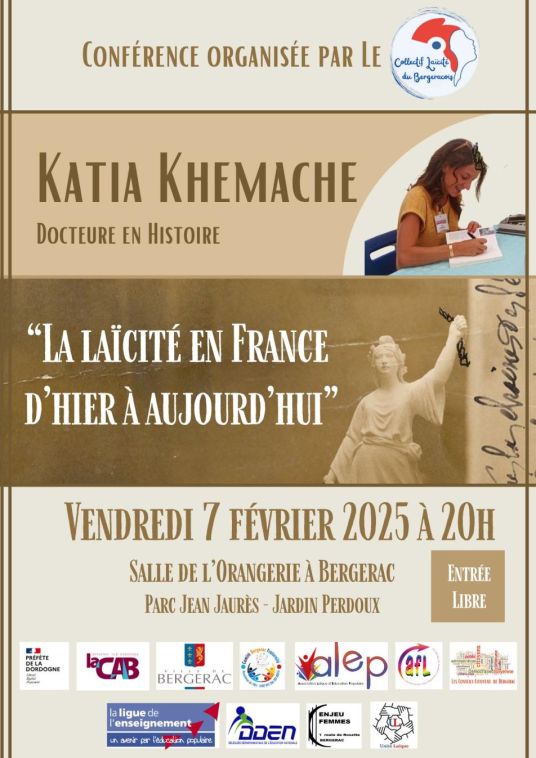 Le Collectif Laïcité du Bergeracois vous invite à une conférence « La Laïcité en France d'hier à aujourd'hui » de Mme Katia KHEMACHE, docteure en Histoire. La loi du 9 décembre 1905 fêtera les 120 ans de sa promulgation en fin d'année. Ce sujet est revenu au cœur des préoccupations de notre République et on peut affirmer qu'elle doit « affronter de nouveaux défis au tournant du XXIème siècle »