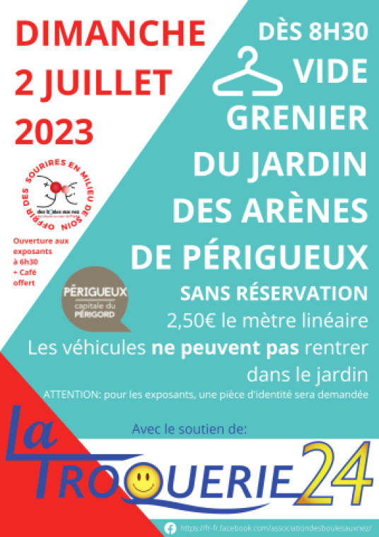 Le vide grenier au profit de l'association des Boules Aux nez est de retour ! Le dimanche 2 juillet au Jardin des Arènes : les bénéfices de l'évènement serviront à financer les interventions des clowns en milieu de soin et de vie.